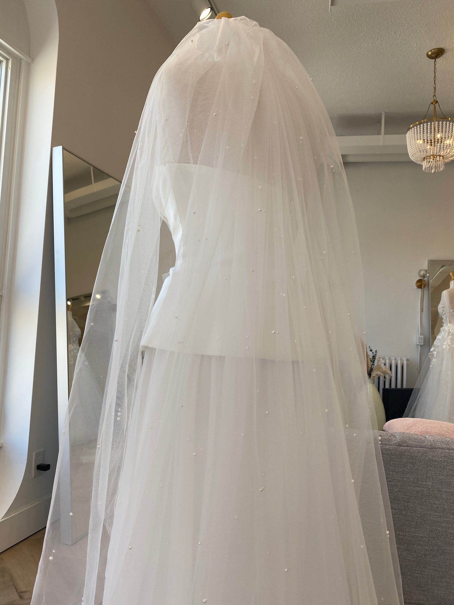 For the brides who want an elegant addition to a simple style, the Iris Veil is the perfect choice. Delicate tulle is cut to frame your silhouette, and adorned with stunning scattered pearls. This is a style that will be eternally bridal, and treasured for decades after.