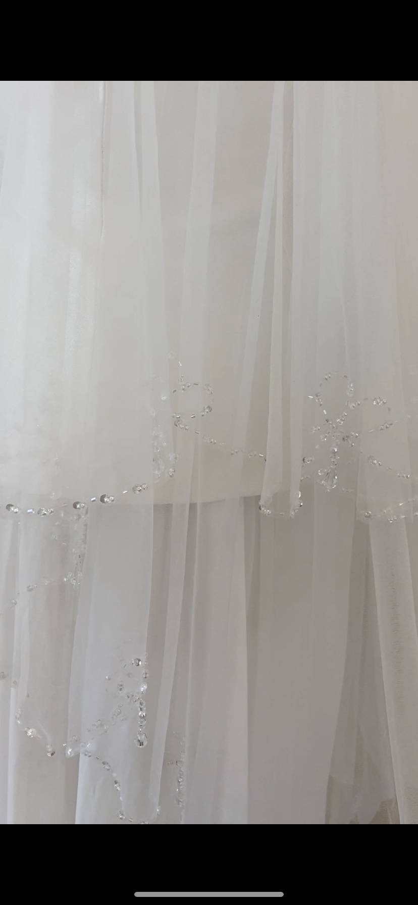 Twinkling beads trim the cloud-soft tulle of this stunning blusher-style veil. While understated, this veil boasts an undeniable and unique touch of glam. This is the perfect look for brides who love to capture a spark of personality in every piece from their big day. This elegant veil is sure to be treasured for years to come.
