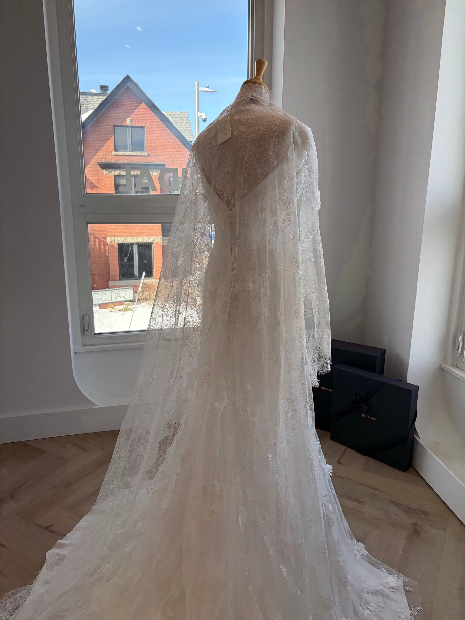 Instead of a comb, the veil is secured with three discreet barrettes, allowing it to sit smoothly and naturally for an authentic Spanish-style drape. This construction creates a seamless, elegant fall over the head and shoulders while ensuring a secure, comfortable fit throughout the day.
