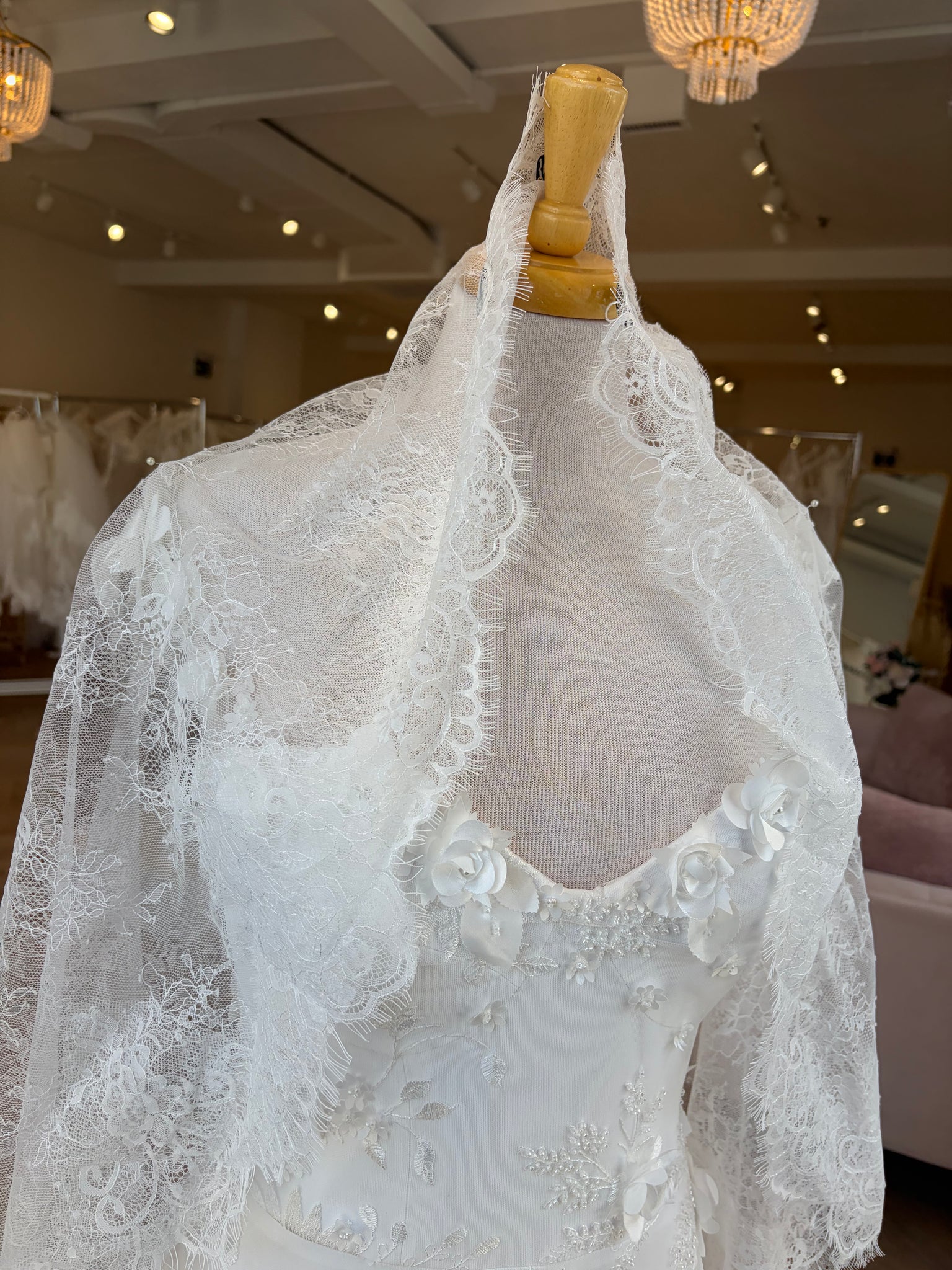 Inspired by traditional Spanish mantilla veils, this full lace veil is designed to make a statement from every angle. Crafted entirely from intricate lace, it frames the face and gown with rich texture and timeless romance.