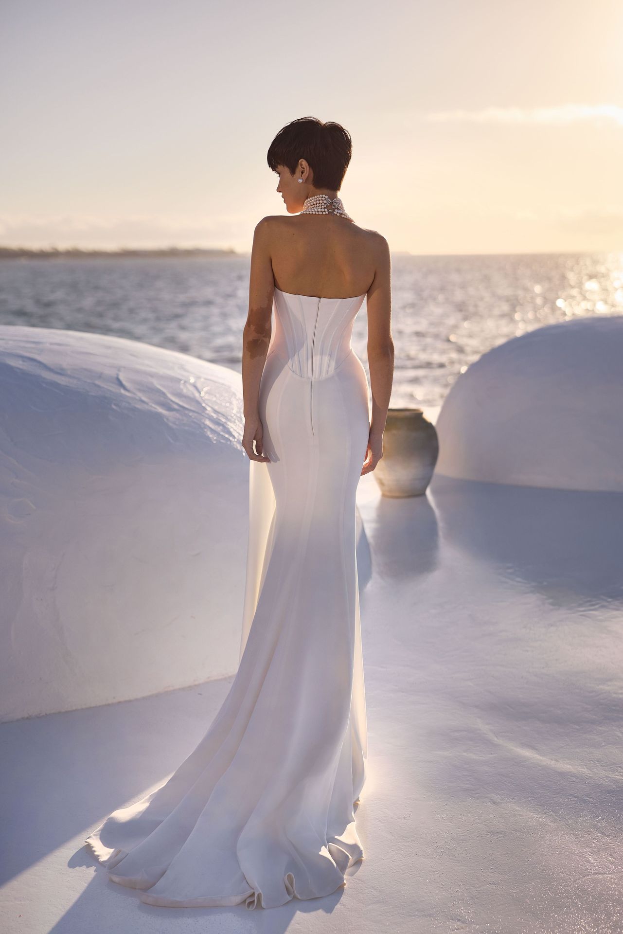 Statuesque mermaid wedding gown, exquisitely crafted from stretch satin. The design is meticulously sculpted into a captivating floor-length draped column silhouette, complemented by a fitted drop-waist corset with visual boning and delicate draping at the heart-shaped neckline, and the maxi skirt with artful drapes at the waist revealing the side slit.